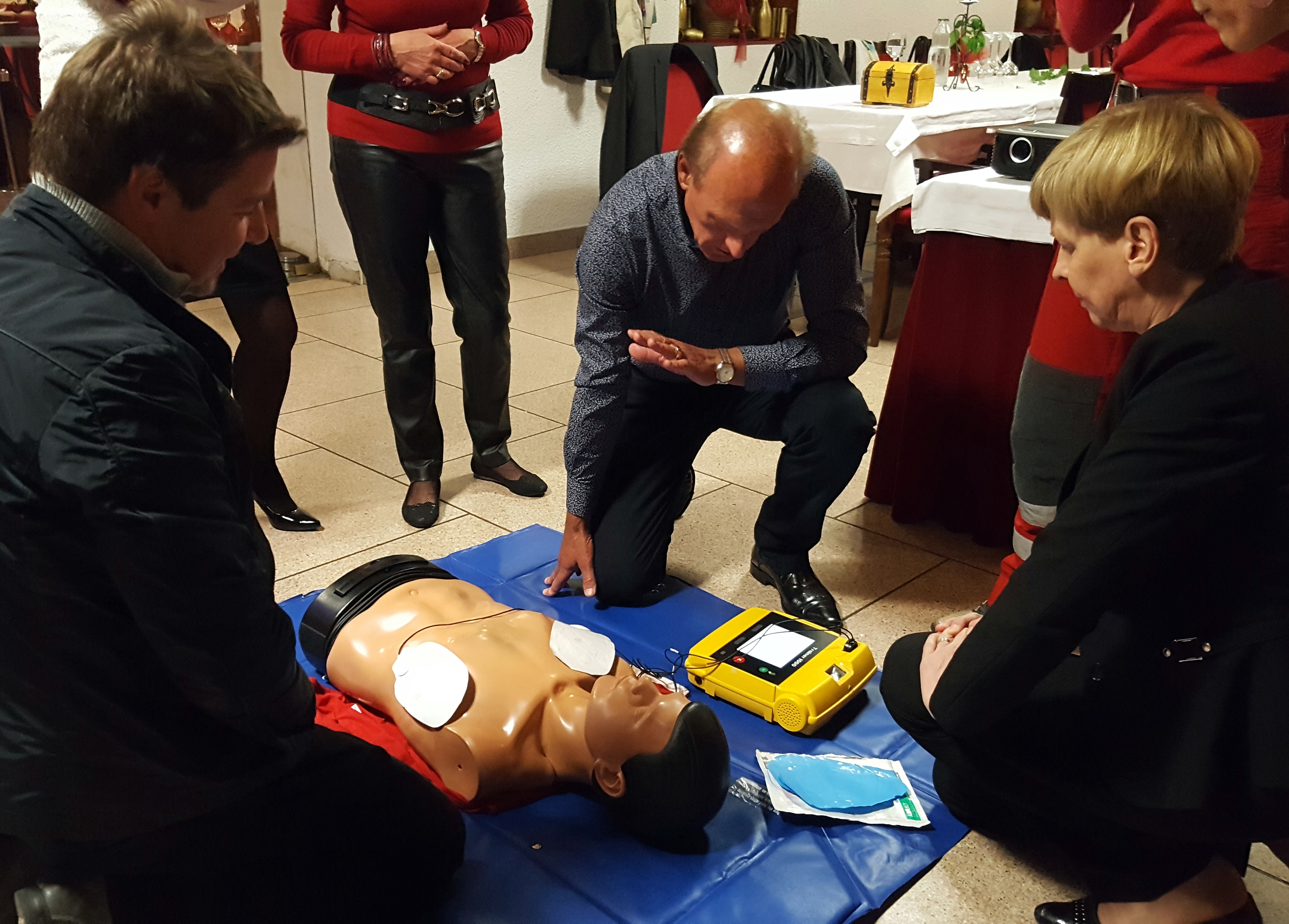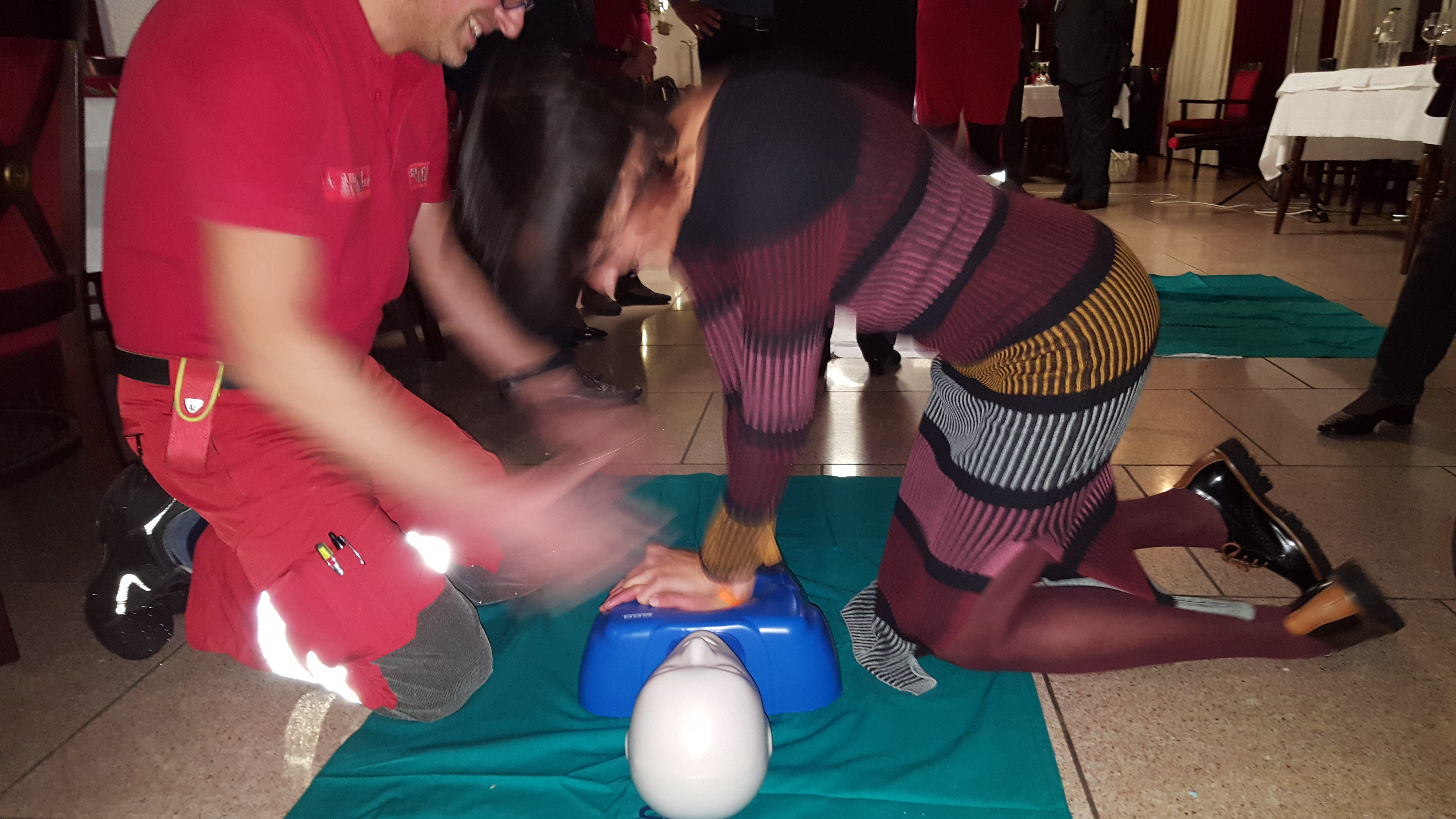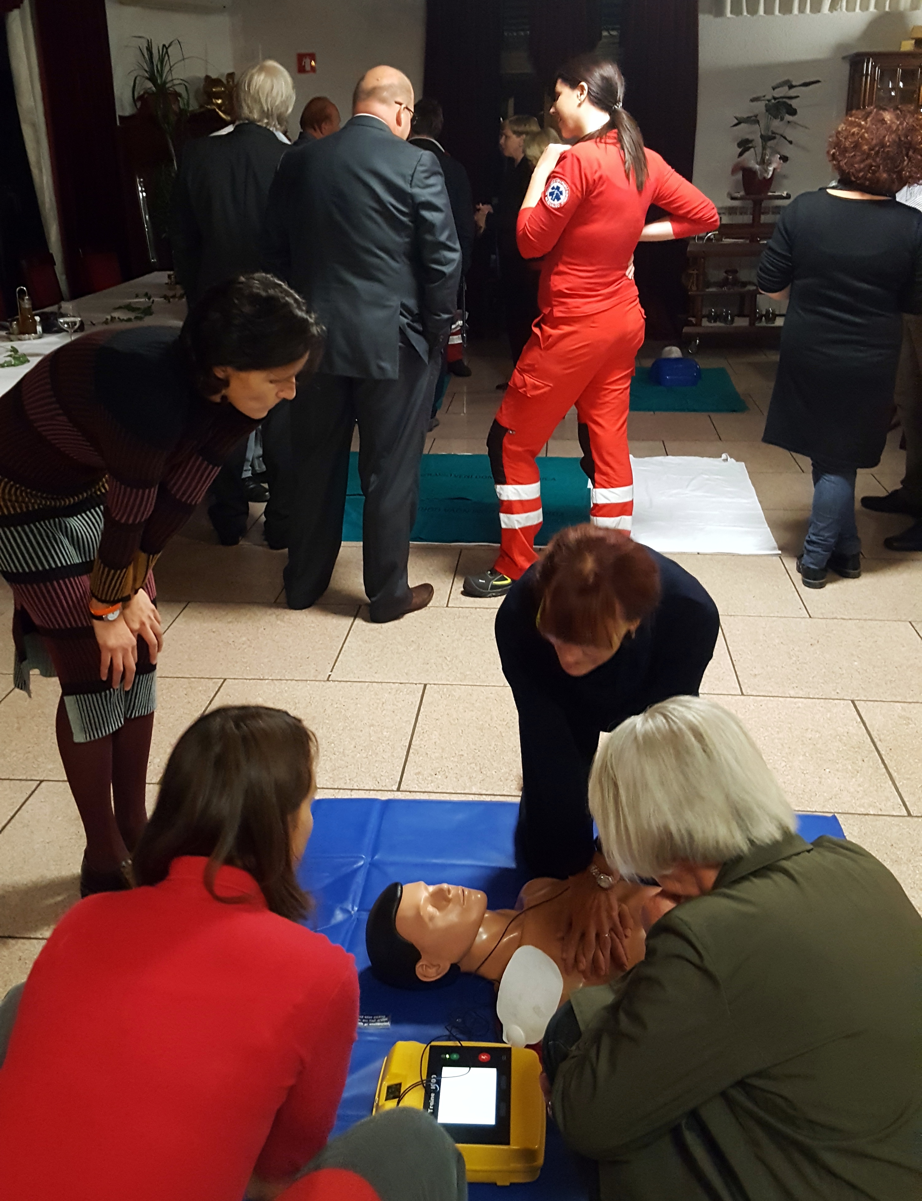 Sledil je tečaj temeljnih postopkov oživljanja za laike, ki ga je vodila direktorica Zdravstvenega doma Nova Gorica, gospa Petra Kokoravec, dr. med, specialistka družinske medicine in inštruktorica Evropskega združenja za oživljanje s sodelavci. Zakaj tečaj oživljanja? 1. Ena nenadna smrt nastopi na 1000 ljudi. 2. V -90% primerih je prisoten očividec. 3. Pomembno je, da situacijo takoj prepoznamo in ustrezno ukrepamo. 4. S pravilnim postopkom oživljanja rešimo veliko življenj. 5. Defibrilator rešuje življenja. 6. Vaja dela mojstra, predvsem pa zmanjšuje strah in negotovost, ko se nekaj hudega zgodi.
