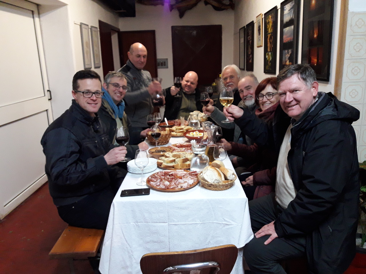 V soboto 12.01.2019 nas je član našega kluba, priznani kraški vinar Jordan Štrekelj, gostil v domačem kraju - na Gorjanskem. Poleg članov kluba (Jordan Šterkelj, Goran Živec, Rasti Fakuč, Lucijan Cenčič, Tomaž Živec, Predrag Škrinjar) so se dogodka udeležili tudi gostje: ga. Majda Cenčič (soproga Lucijana Cenčiča), Bor Živec (sin Gorana Živca) ter kot gost Rastija Fakuča tudi g. Joško Sirk, lastnik slovite, z Michelinovo zvezdico nagrajene restavracije La Subida. Potem ko smo se zbrali “na placu” pred cerkvijo, smo si najprej ogledali prelepo renovirano notranjost gorjanske cerkve z zanimivimi upodobitvami križevega pota, ki jih je ustvaril priznani slovenski umetnik Tone Kralj. Vse oglede sta vodila Jordan Štrekelj in tudi Goran Živec, prav tako domačin z Gorjanskega. Po ogledu cerkve smo obiskali spominsko sobo Karla Štreklja, priznanega slovenskega filologa ter zbiralca narodne poezije, poleg katere je urejen tudi manjši muzej o vlogi Gorjanskega v prvi svetovni vojni. Sledil je kratek sprehod in ogled največjega vojaškega pokopališča iz prve svetovne vojne na slovenskih tleh. Druženje se je nadaljevalo v Jordanovi vinski kleti, kjer smo za bogato obloženo mizo uživali v izbranih jedeh in pijačah. Nato nam je Jordan pripravil še degustacijo njegovih izvrstnih vin; ob plemeniti kapljici se je prijetno druženje podaljšalo še krepko v večer.