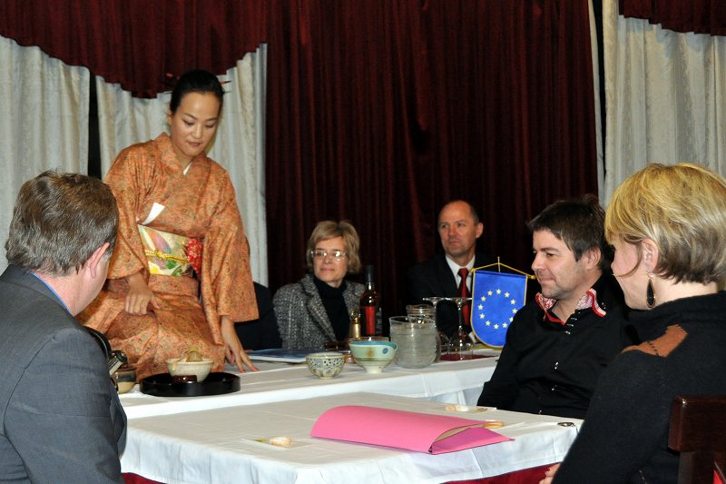 Na večeru je gospa Keiko Miyazaki Vahčič predstavila japonski obred pitja čaja, od zgodovinskih korenin in pridelave čaja do izjemno zanimive predstavitve tega zelo pomembnega družabnega obreda, ki ima na Japonskem zelo dolgo tradicijo.