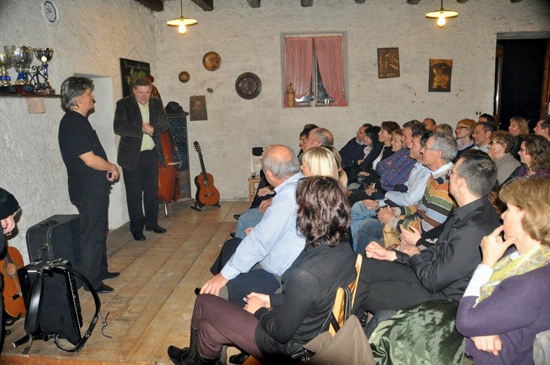 In končno se je zgodilo! Po zaslugi Lucijana Cenciča, predsednika Rotary kluba Nova Gorica, smo ta večer lahko uživali v nepozabni predstavi Iztoka Mlakarja, ki nas je ob spremljavi Davida Šuligoja popeljal v doslej še nikoli raziskani svet slovenske ljudske pesmi. Ob toplem ognjišču osmice